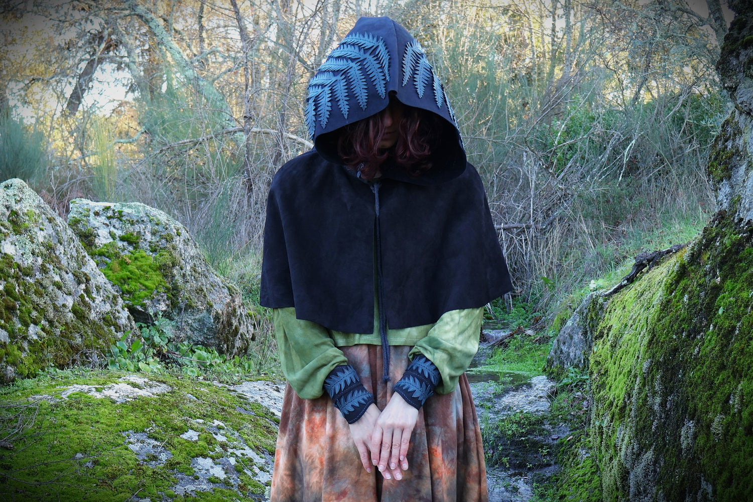 The pointed hooded cloak drapes softly for movement and mystery, while the fern-leaf bracers add a touch of quiet magic, like something gifted by the forest itself. Designed to be worn together, this set is perfect for Renaissance fairs, LARP adventures, cosplay, fantasy weddings, and moonlit gatherings.